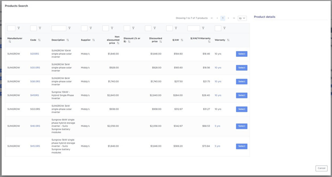 - Locate the inverter you are looking for and select it using the buttons on the right hand side. If there are multiple pages then you can try using the search boxes at the top of each column to find the product accordingly.