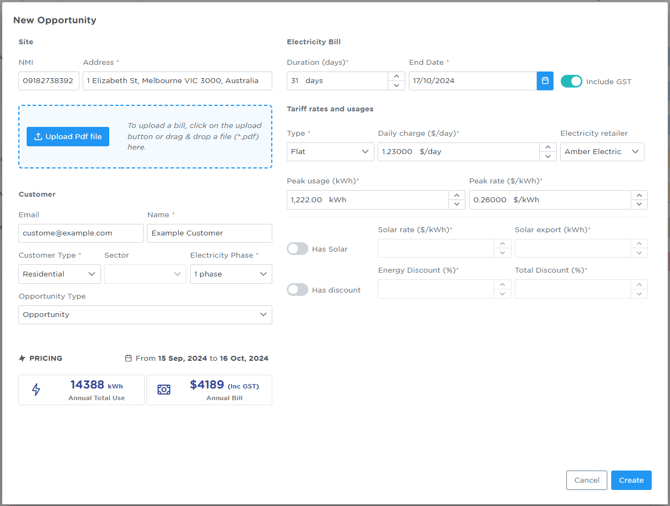 Either :- Drag-n-drop a customers pdf bill then select the customers phase (this can not be known off the bill unfortunatly!) then click Create, or