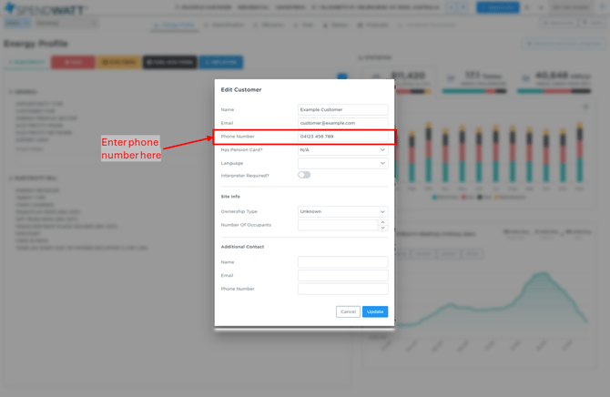 - Enter the customer’s phone number and click Update to save the changes.
