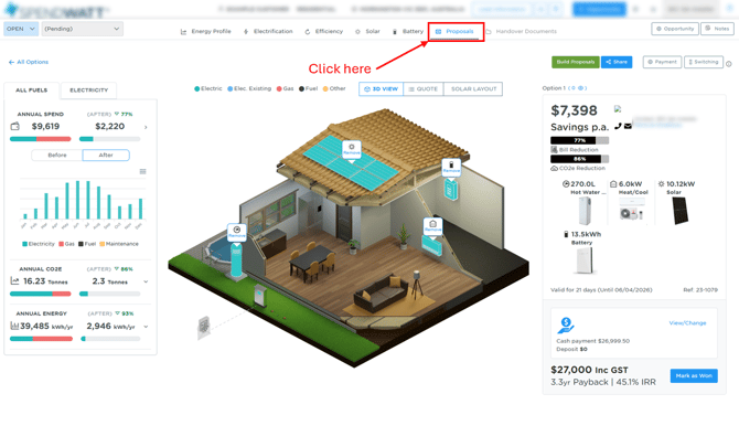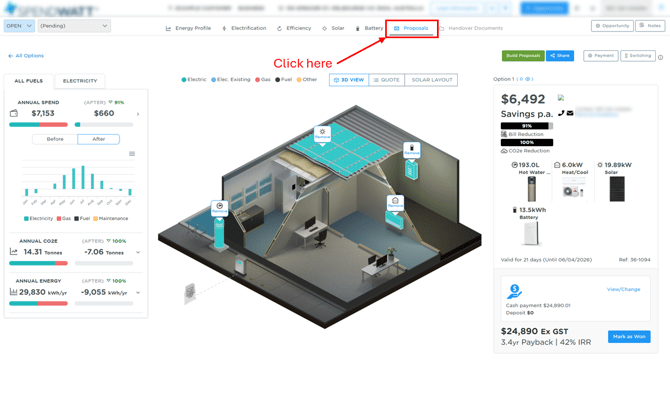 Here is where you can preview the customer proposal. Here is also where you can change some things to help maximise your chances of sales conversion. And lastly, when you are happy with the proposal, here is where you share it with the customer from.