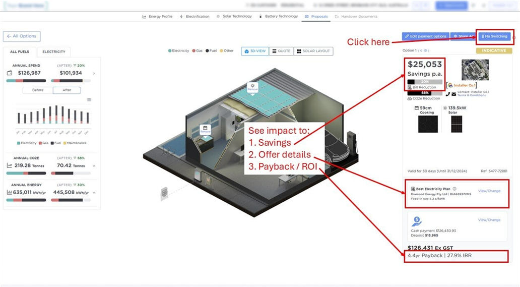 Note: The customers can not see the Switching button, so you have control if they can see the offers to switch or not. If Switching is on when you share the proposal then the customers can see the retail energy offers and even select what one they like the best - if Switching is off they can not see the retail energy offers and their existing rates will be assumed for their forecast costs once the project is completed.