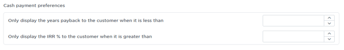 This setting hides the "payback period" if the calculated time to recoup the investment exceeds the number of years you enter here. This ensures customers only see payback figures when they are commercially attractive. - Only display the IRR % to the customer when it is greater than: