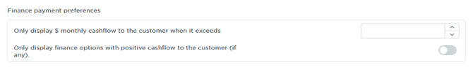This input field allows you to set a specific dollar threshold for monthly savings. The monthly cashflow figure will be hidden from the customer unless the calculated savings exceed this amount. - Only display finance options with positive cashflow to the customer (if any):