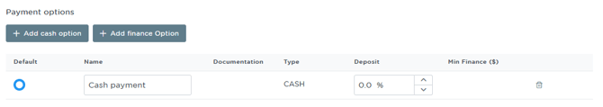 Min Finance ($): Specifies the minimum project value required for a finance option to be available.