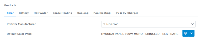Solar & Battery: Select your preferred Inverter Manufacturer and Default Solar Panel. For batteries, selecting a manufacturer allows the system to automatically scale the storage capacity based on the site's energy profile.
