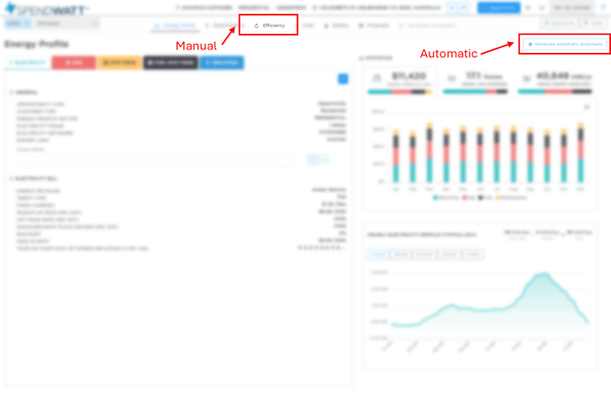 After a) the opportunity has been created and b) you have completed setting up the customer's energy profile, you have two ways of creating Efficiency proposals: